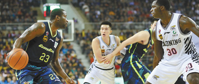3月29日,辽宁队球员巴斯(右一)在比赛中防守广东队球员斯隆(左一)。新华社记者 李 钢摄