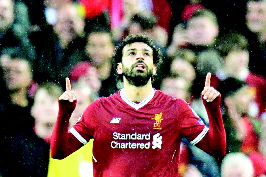 北京时间4月25日,在欧冠半决赛首回合比赛中,利物浦队球员萨拉赫庆祝进球。
