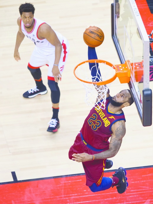 5月2日,在2017-2018赛季NBA季后赛东部半决赛首轮比赛中,克利夫兰骑士队客场以113比112战胜多伦多猛龙队,总比分1比0暂时领先。图为骑士队球员詹姆斯(右)在比赛中上篮。新华社发
