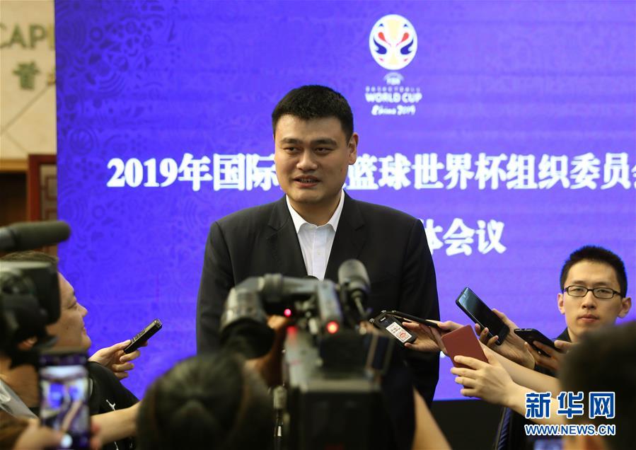 ↑6月11日,中国篮球协会主席姚明在会议后接受采访。新华社记者孟永民 摄