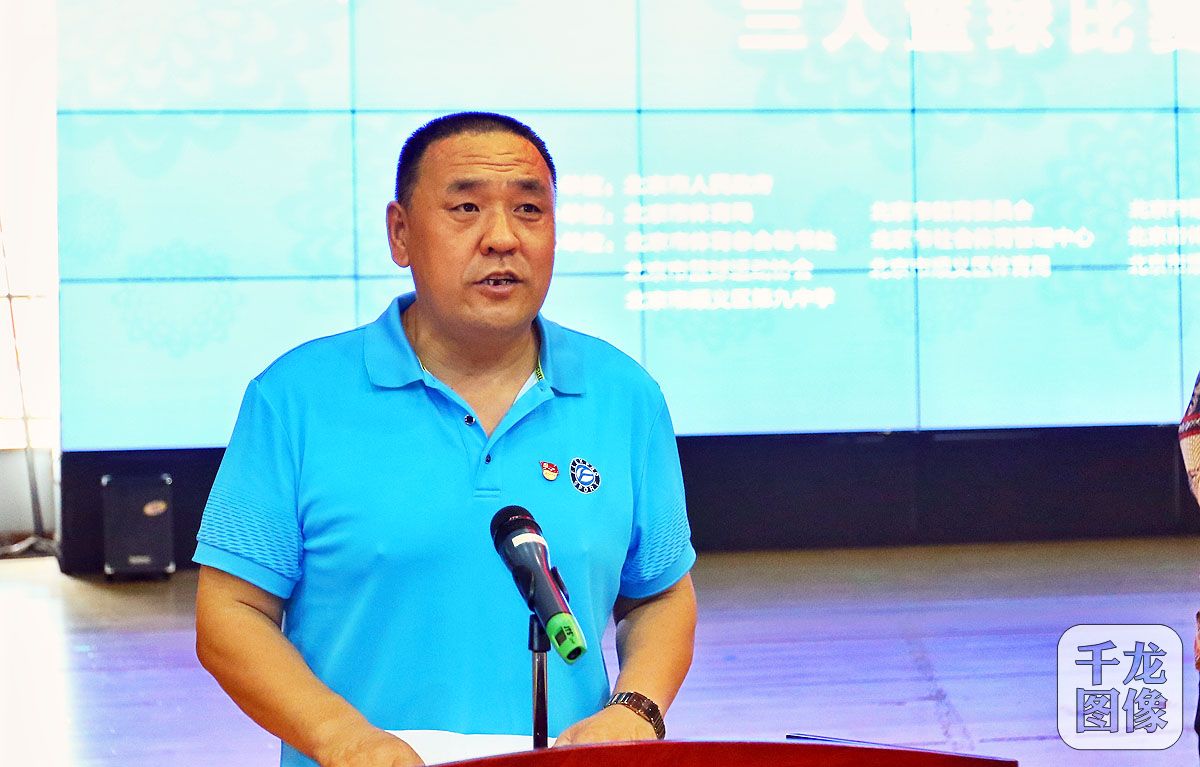 6月24日,北京市第十五届运动会群众项目三人制篮球比赛在顺义区第九中学篮球馆举行。本次比赛北京市15个区、亦庄开发区及燕山地区的26支代表队,共210名运动员、教练员和领队及30余名裁判员参加。图为顺义区体育局局长李成致辞。千龙网发 大胡摄