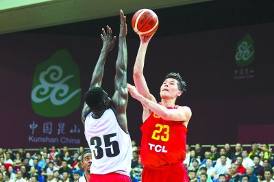 上图:中国男篮红队阿布都沙拉木在昨晚与安哥拉队的比赛中。