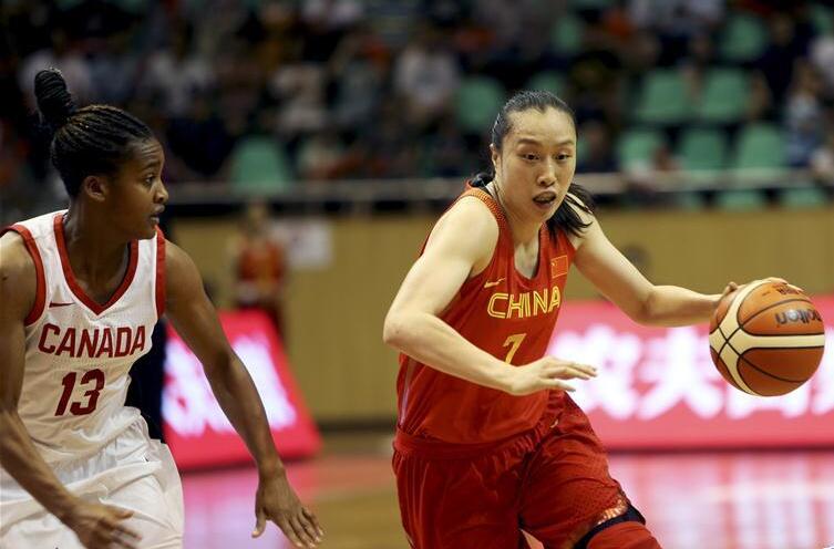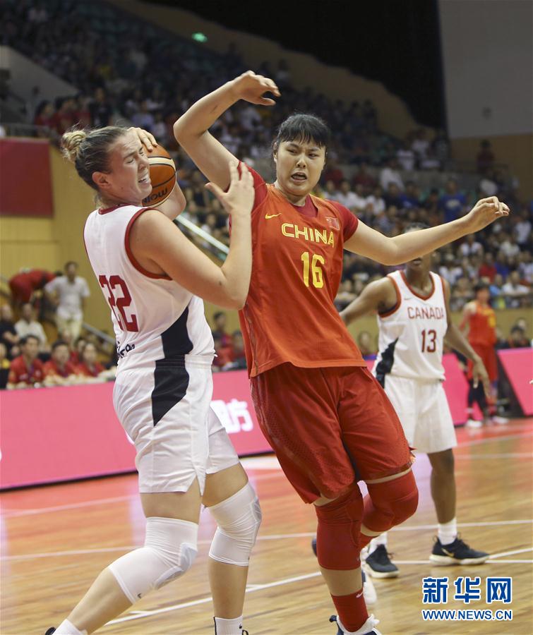 ↑8月1日,中国队球员李月汝(右)在比赛中和加拿大队球员罗斯·汉姆布琳在比赛中争抢。 当日,在广东湛江举行的2018中加国际女篮对抗赛中,中国队以82比65战胜加拿大队。 新华社记者张加扬摄