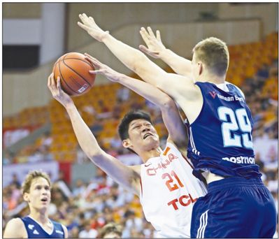 8月15日,中国男篮蓝队球员胡金秋(中)在比赛中上篮。当日,在广东深圳进行的2018斯坦科维奇杯洲际篮球赛的比赛中,中国男篮蓝队以87∶84战胜芬兰队。双方在前四节战成73∶73,加时赛两队比分交替上升,最终,中国男篮蓝队以87∶84胜出。本场比赛,中国男篮蓝队的周鹏拿下了全场最高的22分并有3篮板3助攻,吴前砍下16分,胡金秋10分7个篮板入账。芬兰队的帕尔米拿下14分,赫沃宁与詹图南分别贡献了12分与11分。