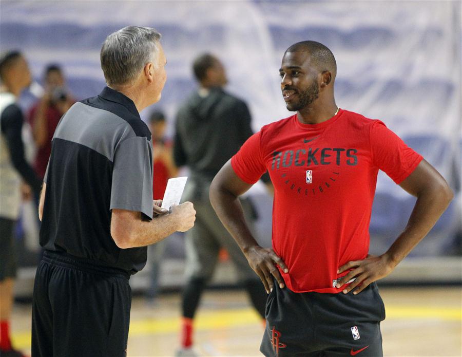 新华社照片,休斯敦,2018年9月28日 (体育)(1)篮球——NBA:火箭队备战新赛季 9月27日,火箭队队员保罗(右)在训练现场同主教练德安东尼交谈。 当日,NBA休斯敦火箭队在路易斯安那州莱克查尔斯市训练,备战2018-2019赛季比赛。 新华社发(宋穹摄)