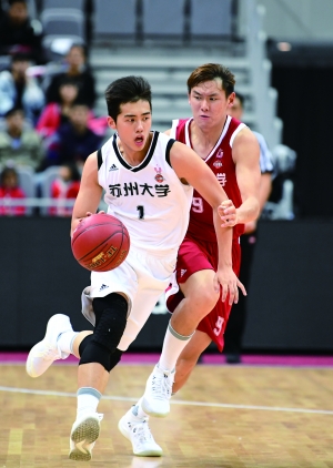 由中国大学生体育协会主办的CUBA中国大学生篮球联赛2018/2019赛季,昨天在江苏省苏州市高新区文体中心体育馆正式开打。在揭幕战中,南京财经大学队以76比67战胜了苏州大学队。图为双方球员在比赛中。北京晨报记者 史春阳/摄