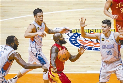 11月11日,吉林九台农商银行队球员琼斯(左三)在比赛中上篮。新华社记者 赵戈 摄