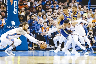 12月10日,雷霆队球员威斯布鲁克(左三)和亚当斯(左一)在比赛中和爵士队球员米切尔(左二)拼抢。当日,在2018-2019赛季NBA常规赛中,俄克拉何马雷霆队主场以122比113战胜犹他爵士队。 新华社/路透