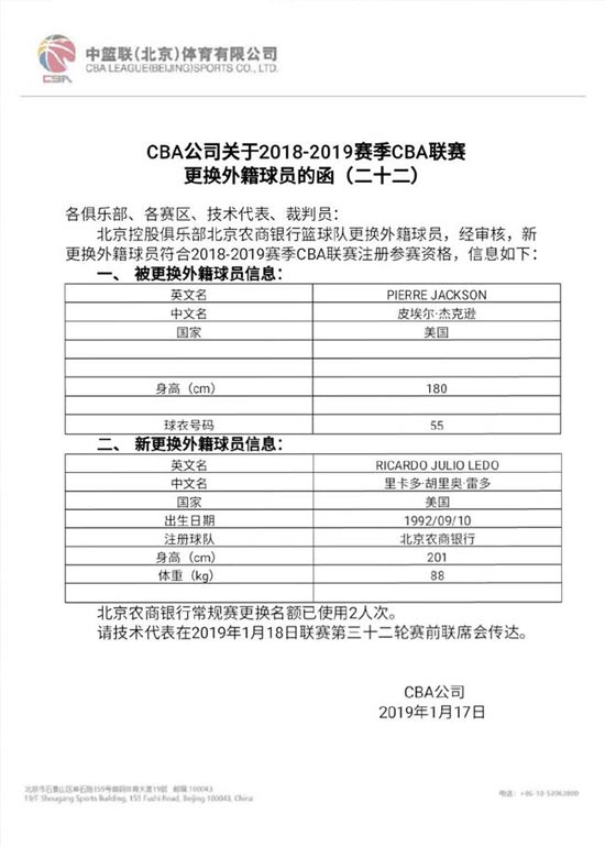 央视网消息:北京时间1月17日,CBA联赛官方宣布,北控男篮用里卡多-胡里奥-雷多暂时替换联赛得分王皮埃尔-杰克逊,以征战接下来的常规赛。而北控男篮常规赛更换外援的次数已经用完了2次。