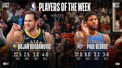 中新网2月12日电 NBA官方公布了上周东西部最佳球员,雷霆球员保罗•乔治和步行者前锋博扬•博格达诺维奇分别当选。