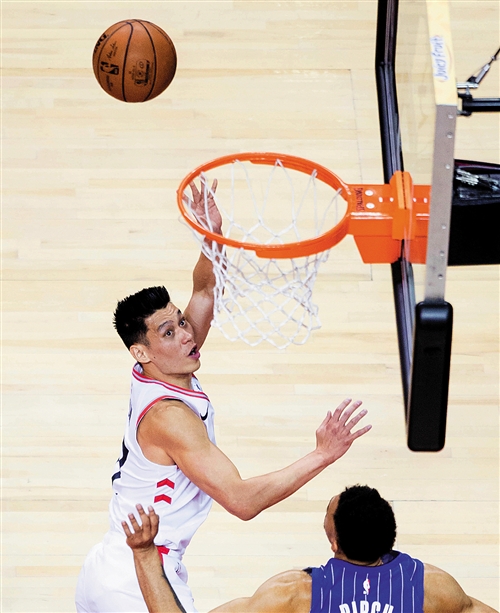 林书豪(左)在比赛中上篮