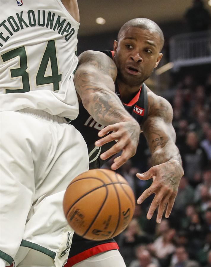 3月26日,火箭队球员戈登在比赛中传球。 当日,在2018-2019赛季NBA常规赛中,密尔沃基雄鹿队主场以108比94战胜休斯顿火箭队。 新华社发(乔尔·莱纳摄)