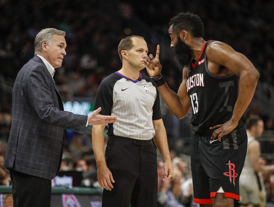 3月26日,火箭队主教练德安东尼(左)与火箭队球员哈登(右)在比赛中质疑裁判判罚。 当日,在2018-2019赛季NBA常规赛中,密尔沃基雄鹿队主场以108比94战胜休斯顿火箭队。 新华社发(乔尔·莱纳摄)