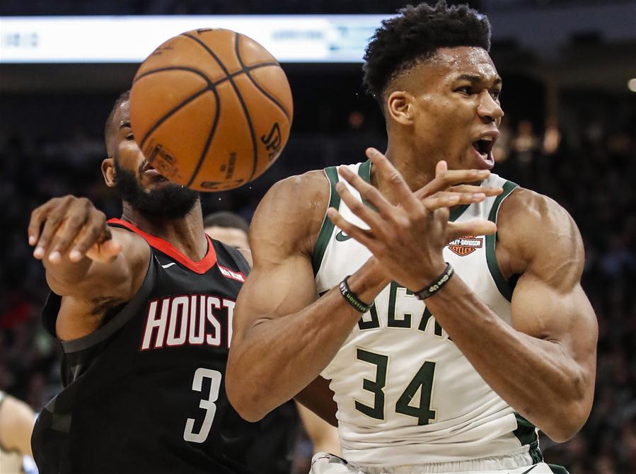 3月26日,火箭队球员保罗(左)在比赛中防守雄鹿队球员安特托昆博。 当日,在2018-2019赛季NBA常规赛中,密尔沃基雄鹿队主场以108比94战胜休斯顿火箭队。 新华社发(乔尔·莱纳摄)