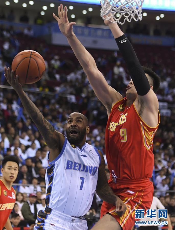 3月30日,北京首钢队球员杰克逊(中)在比赛中上篮。 当日,在2018-2019赛季中国男子篮球职业联赛(CBA)季后赛四分之一决赛第三回合比赛中,北京首钢队主场以110比116不敌深圳马可波罗队,北京首钢队暂时以总比分2比1领先。 新华社记者张晨霖摄