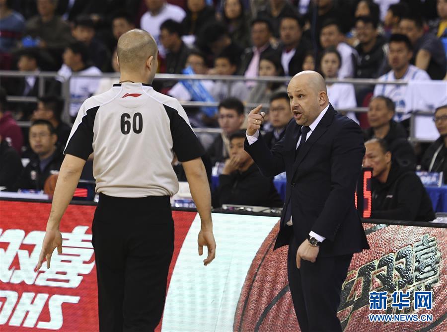 北京首钢队主教练雅尼斯(右)在比赛中与裁判交流。新华社记者张晨霖摄