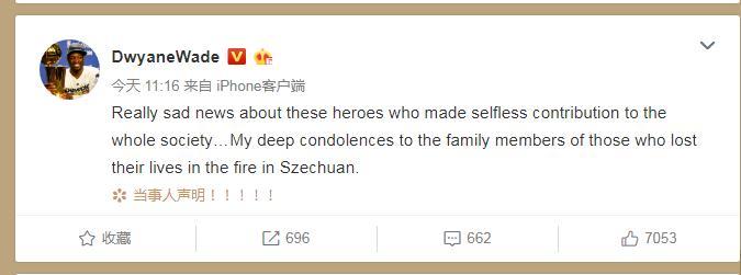 中新网4月4日电 北京时间今天中午,NBA巨星德怀恩-韦德在微博更新动态,向四川凉山火灾牺牲的消防员以及他们的家人送上祝福。