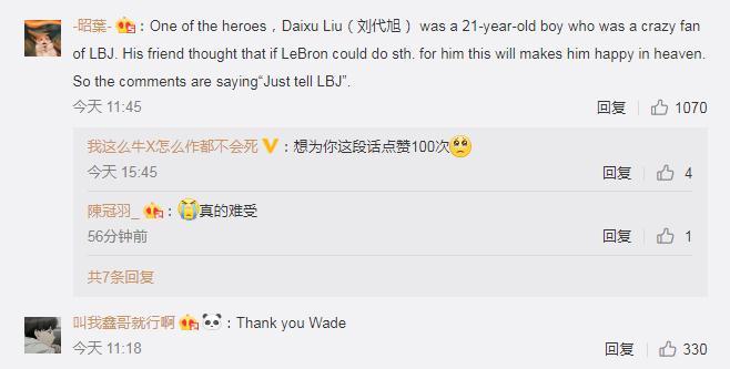 网友留言希望韦德能像勒布朗转达刘代旭的英雄事迹。