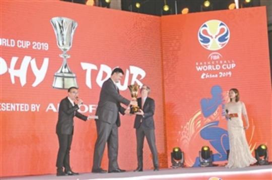姚明(左二)从国际篮联代表林德斯手中接过男篮世界杯的冠军奖杯。本报记者 吴凡 摄