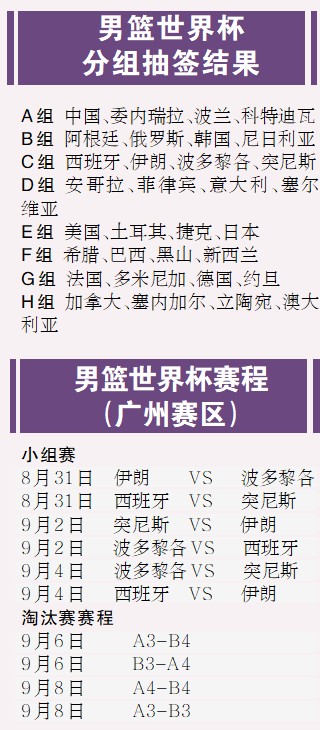 据介绍,广州赛区将进行小组赛和淘汰赛共计10场比赛,其中,C组比赛全部在广州举行,预计将有多达10名NBA球员莅临广州,当然,拥有NBA球员最多的当数世界冠军西班牙队,他们将接受伊朗队、波多黎各队和突尼斯队的挑战。