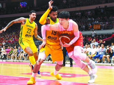 中国男篮在昨天的热身赛中再次不敌巴西队。新华社发