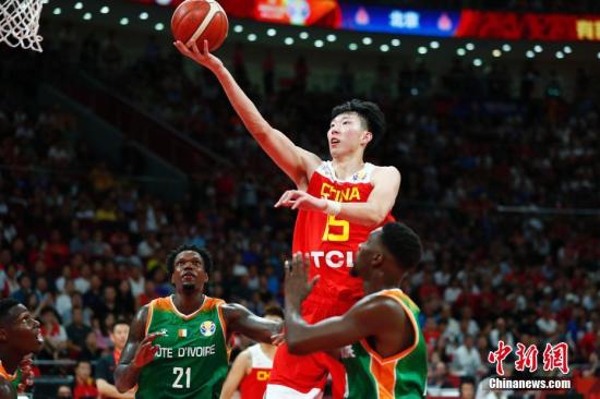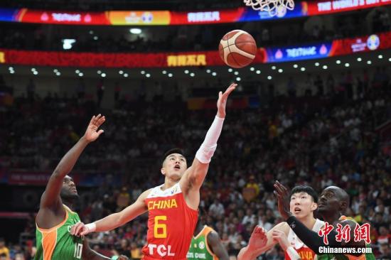 8月31日,中国球员周琦(右二)在比赛中上篮。当日,在北京进行的2019年国际篮联篮球世界杯A组小组赛中,中国队以70:55战胜科特迪瓦队。中新社记者 富田 摄