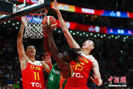 8月31日,中国球员周琦(右)在比赛中封盖。当日,在北京进行的2019年国际篮联篮球世界杯A组小组赛中,中国队以70:55战胜科特迪瓦队。中新社记者 富田 摄