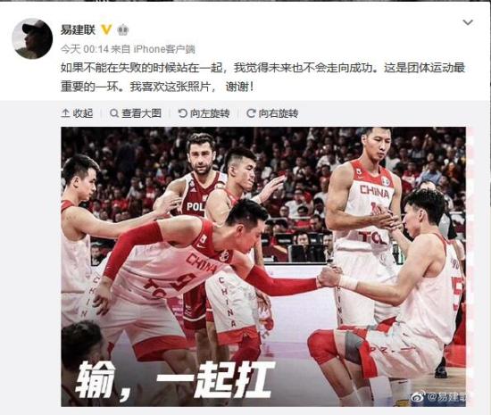 相比赛场上出现的意外,中国队的团结更令人印象深刻。在周琦的微博被愤怒的球迷“攻陷”后,作为中国男篮队长的易建联第一时间站出来力挺队友。易建联说:“如果不能在失败的时候站在一起,我觉得未来也不会走向成功。”