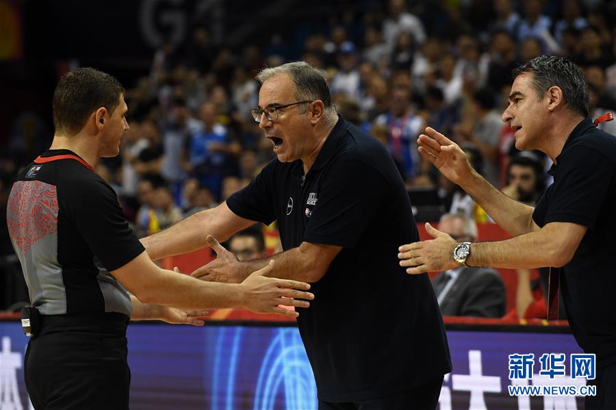 9月5日,希腊队主教练库尔托普洛斯(中)与裁判交流。 当日,在南京举行的2019年国际篮联篮球世界杯F组小组赛中,希腊队以103比97战胜新西兰队。 新华社记者韩瑜庆摄