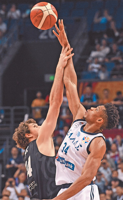 9月5日,球员在比赛中争球。当日,在南京举行的篮球世界杯F组小组赛中,希腊队以103∶97战胜新西兰队。