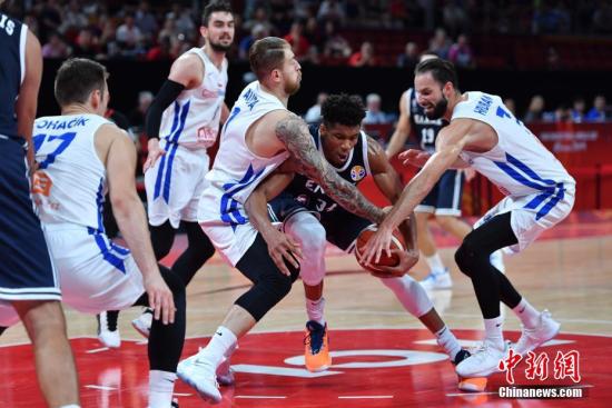 9月9日下午,在深圳湾体育馆举行的2019年国际篮联篮球世界杯第二轮K组的一场比赛中,希腊队(蓝)以84比77战胜捷克队(白)。图为希腊队34号球星G.ANTETOKOUNMPO (扬尼斯-阿德托昆博)遭捷克队员围堵。 中新社记者 陈文 摄