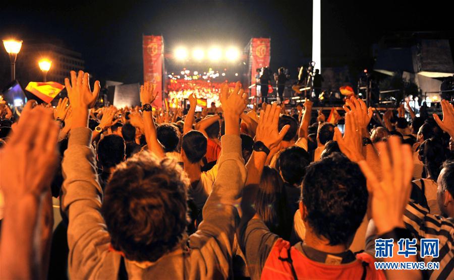 9月16日,球迷在马德里哥伦布广场参加庆祝活动。 当日,西班牙首都马德里举行盛大庆祝活动,庆祝西班牙国家队夺得2019年篮球世界杯冠军。 新华社记者郭求达摄