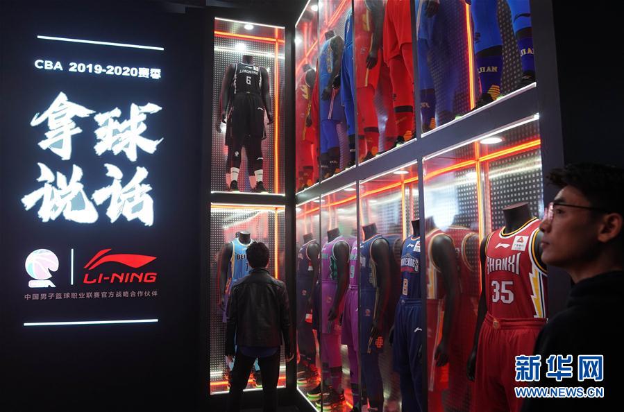 10月23日,与会者在发布会前参观新赛季比赛服。 当日,2019-2020赛季中国男子篮球职业联赛(CBA)新闻发布会在北京举行。 新华社记者 孟永民 摄