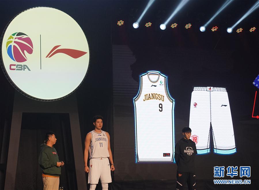 10月23日,江苏肯帝亚队球员吴冠希(中)在发布会上展示新赛季队服。 当日,2019-2020赛季中国男子篮球职业联赛(CBA)新闻发布会在北京举行。 新华社记者 孟永民 摄