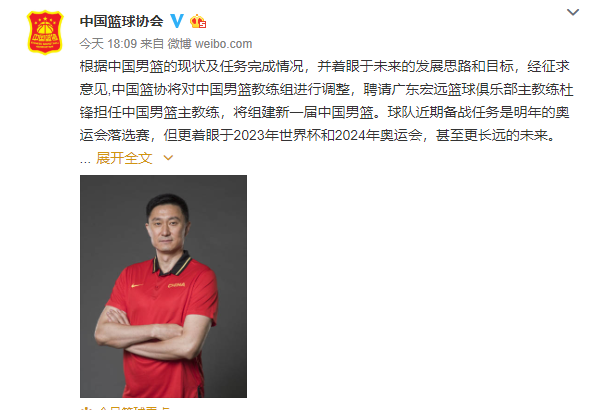 根据中国男篮的现状及任务完成情况,并着眼于未来的发展思路和目标,经征求意见,中国篮协将对中国男篮教练组进行调整,聘请广东宏远篮球俱乐部主教练杜锋担任中国男篮主教练,将组建新一届中国男篮。球队近期备战任务是明年的奥运会落选赛,但更着眼于2023年世界杯和2024年奥运会,甚至更长远的未来。