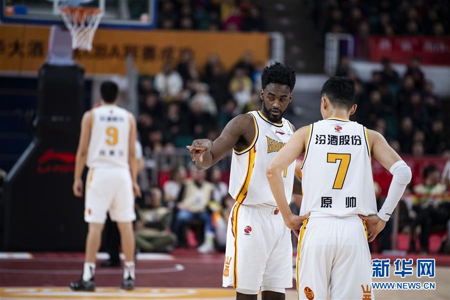 12月18日,山西汾酒股份队球员富兰克林(右)在比赛间隙和队友原帅交流。 当日,在2019-2020赛季中国男子篮球职业联赛(CBA)常规赛第18轮比赛中,山西汾酒股份队主场以127比119战胜浙江稠州银行队。 新华社记者杨晨光摄