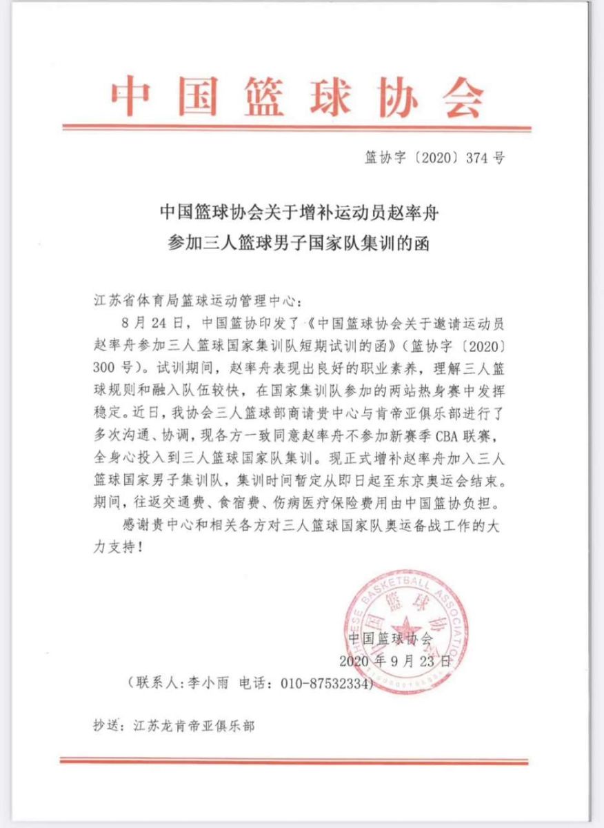 近日,我协会三人篮球部商请贵中心与肯帝亚俱乐部进行了多次沟通、协调,现各方一致同意赵率舟不参加新赛季CBA联赛,全身心投入到三人篮球国家队集训。现正式增补赵率舟加入三人篮球国家男子集训队,集训时间暂定从即日起至东京奥运会结束。期间,往返交通费、食宿费、伤病医疗保险费用由中国篮协负担。
