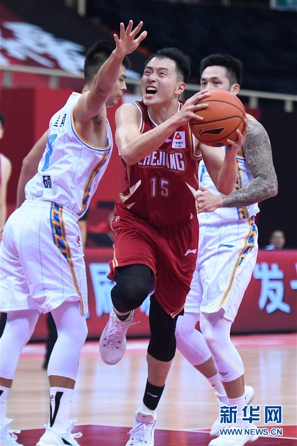 10月20日,浙江稠州金租队球员王奕博(中)在比赛中突破上篮。 当日,在浙江诸暨举行的2020-2021赛季中国男子篮球职业联赛(CBA)第一阶段第二轮比赛中,浙江稠州金租队以92比75战胜北京首钢队。 新华社记者黄宗治摄