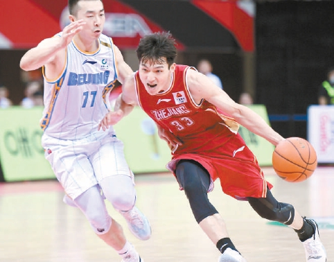 浙江队大将吴前(右)被严防,但首钢队仍未能阻挡住状态正佳的浙江队。新华社供图