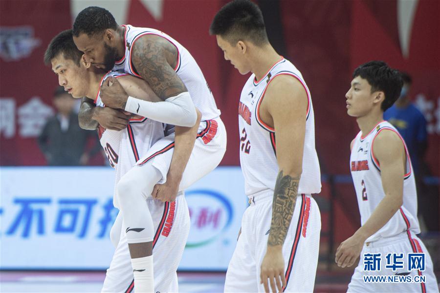 11月3日,广东东莞大益队球员威姆斯(左二)受伤后被队友任骏飞(左一)背出赛场。 当日,在浙江诸暨举行的2020-2021赛季中国男子篮球职业联赛(CBA)第一阶段第八轮比赛中,广东东莞大益队以111比107战胜北京首钢队。 新华社发(江汉摄)