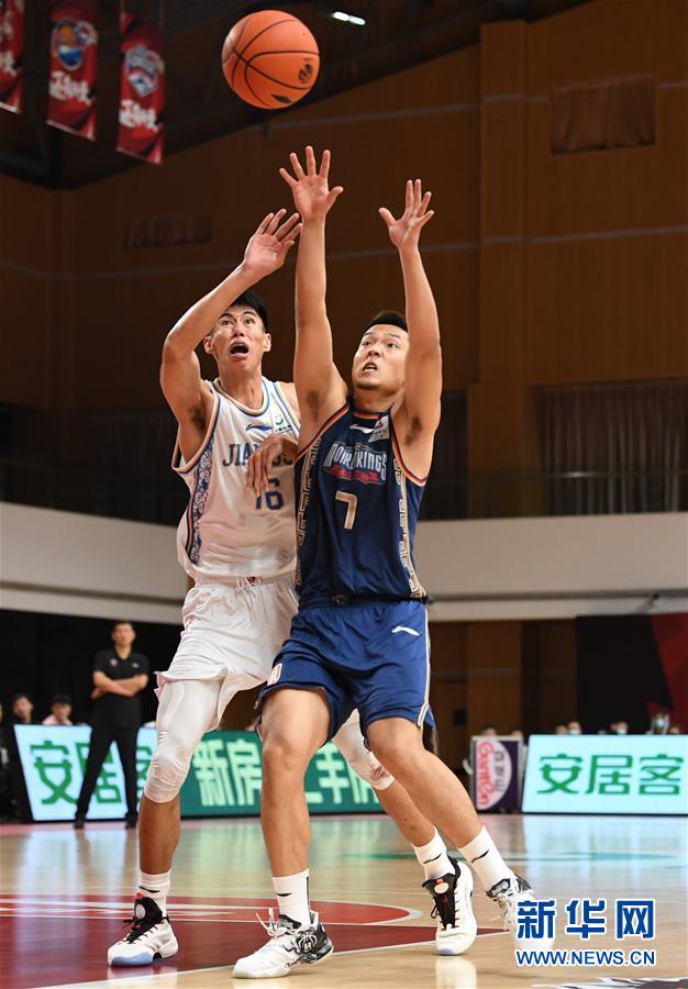 11月6日,南京同曦宙光队球员李泓澎(右)与苏州肯帝亚队球员吴羽佳在比赛中拼抢。 当日,在浙江诸暨举行的2020-2021赛季中国男子篮球职业联赛(CBA)第一阶段第九轮比赛中,南京同曦宙光队以93比108不敌苏州肯帝亚队。 新华社记者 沙达提 摄