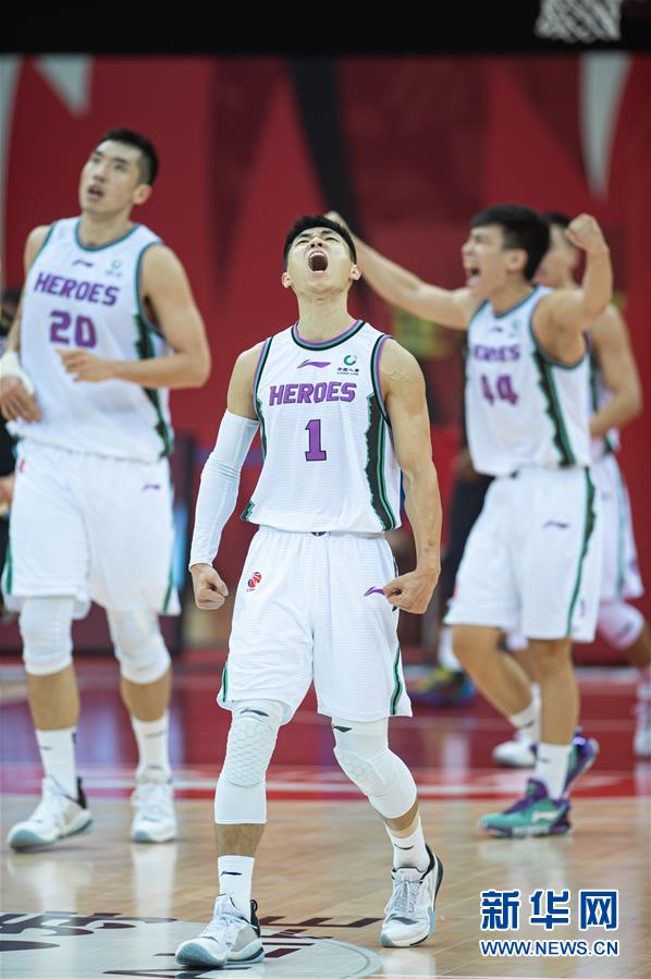 11月6日,山东西王队球员高诗岩(前)在比赛最后时刻得分后庆祝。 当日,在浙江诸暨举行的2020-2021赛季中国男子篮球职业联赛(CBA)第一阶段第九轮比赛中,山东西王队以128比127战胜辽宁本钢队。 新华社发(江汉摄)