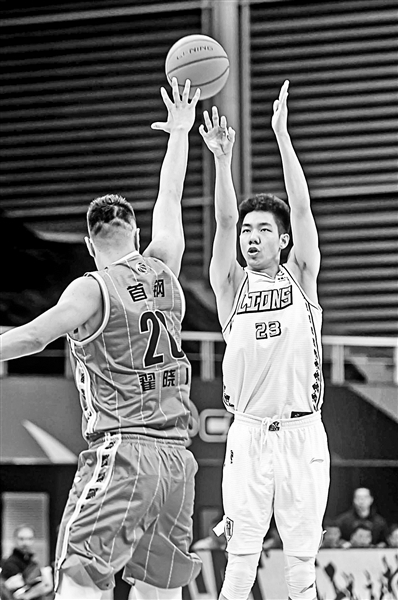 浙江广厦控股队球员朱俊龙(右)投篮供图/新华社