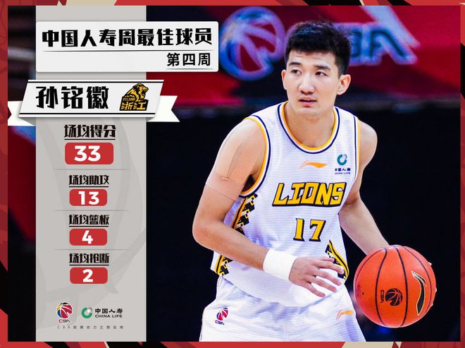 广厦球员孙铭徽在两场比赛中,场均上场45.2分钟,拿到了场均33分13助攻4篮板2抢断,真实命中率67.6%。