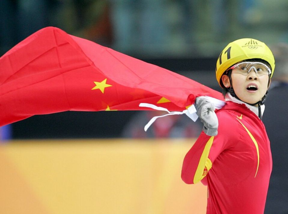 ↑2006年都灵冬奥会,王濛在短道速滑女子500米比赛中夺冠。