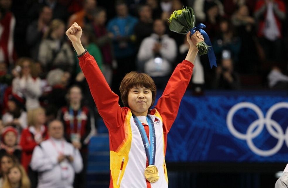 ↑2010年温哥华冬奥会,王濛在短道速滑女子1000米决赛中夺得冠军。