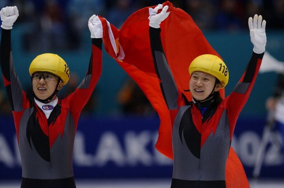 ↑2002年盐湖城冬奥会,杨扬在短道速滑女子500米比赛中夺冠。