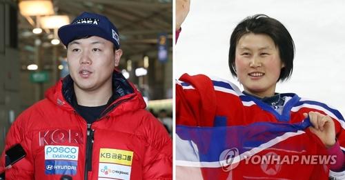 2018平昌冬奥会韩朝代表团开幕式旗手元允宗(左)和黄忠琴。(来源:韩联社。)