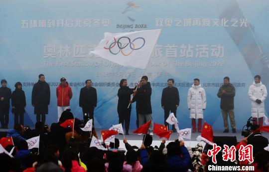 图为北京冬奥组委秘书长韩子荣将奥林匹克会旗交至延庆青少年手中,共同展示会旗。当天活动后,奥林匹克会旗将同冬奥文化主题展览一起移至八达岭会展中心A馆进行展出,展览持续至3月底。 曾鼐 摄