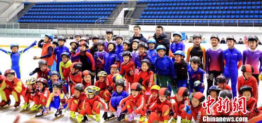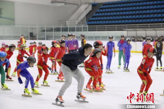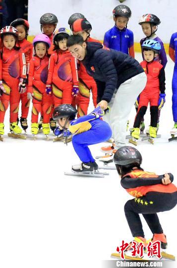 武大靖在教小速滑运动员滑冰(宋洋摄)